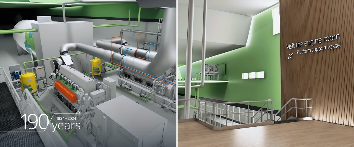 An exciting digital experience awaits you: The Wärtsilä Lounge is a virtual space where you can experience the Wärtsilä 25 Ammonia engine and example applications in real size.