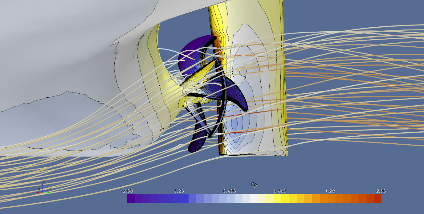 OPTI Design gives lots of different visualisation options – the next picture shows how the flow is directed, entering the EnergoFlow and going to the propeller.