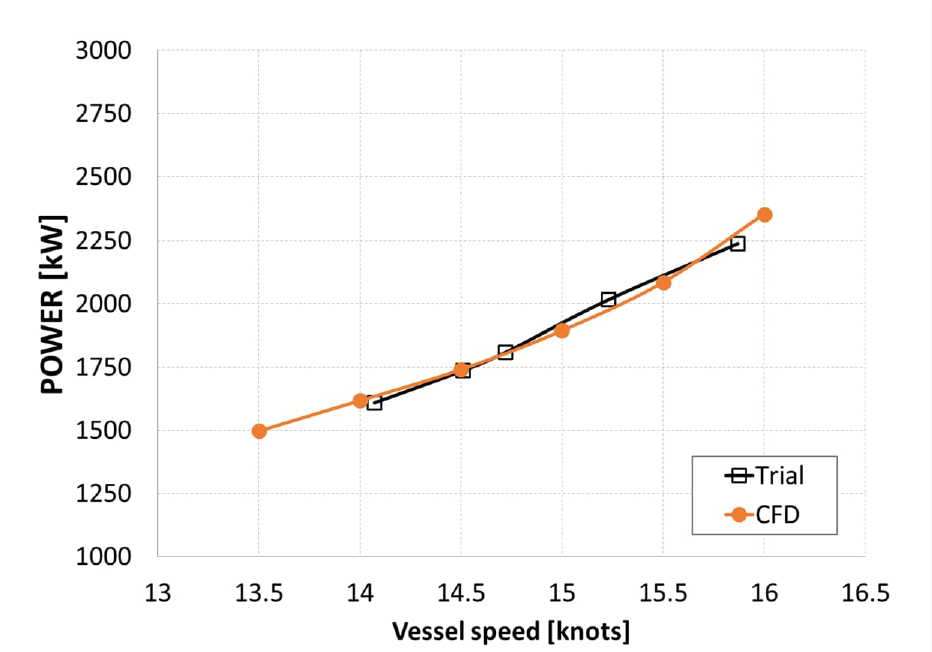 Did you know that OPTI Design can even help to accurately predict what speeds you can expect to see during sea trials and beyond? The next graph shows ballast power-speed predictions and how closely they map to actual trial results.