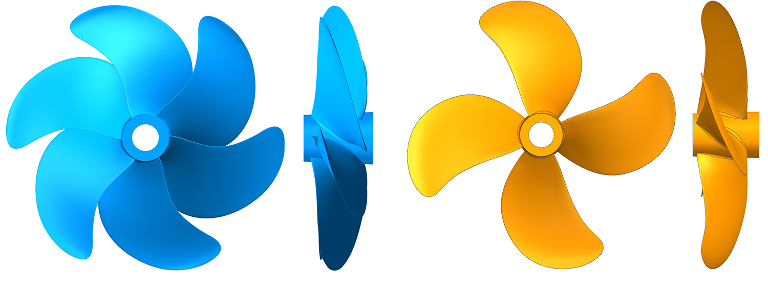 In this case the original propeller is shown in blue. The optimised slow-steaming design is shown in orange. It has fewer blades, a lower blade area ratio, a bigger diameter and a new blade shape.