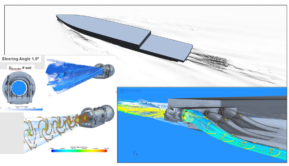 Many parts of a vessel can be optimised using simulations, making the vessel perform better as a whole. Take waterjets: the top picture shows a self-propulsion simulation that helps with mapping the velocity upstream of the inlet ducts. Doing this enables experts to optimise the shape of the ducts, improving overall performance.