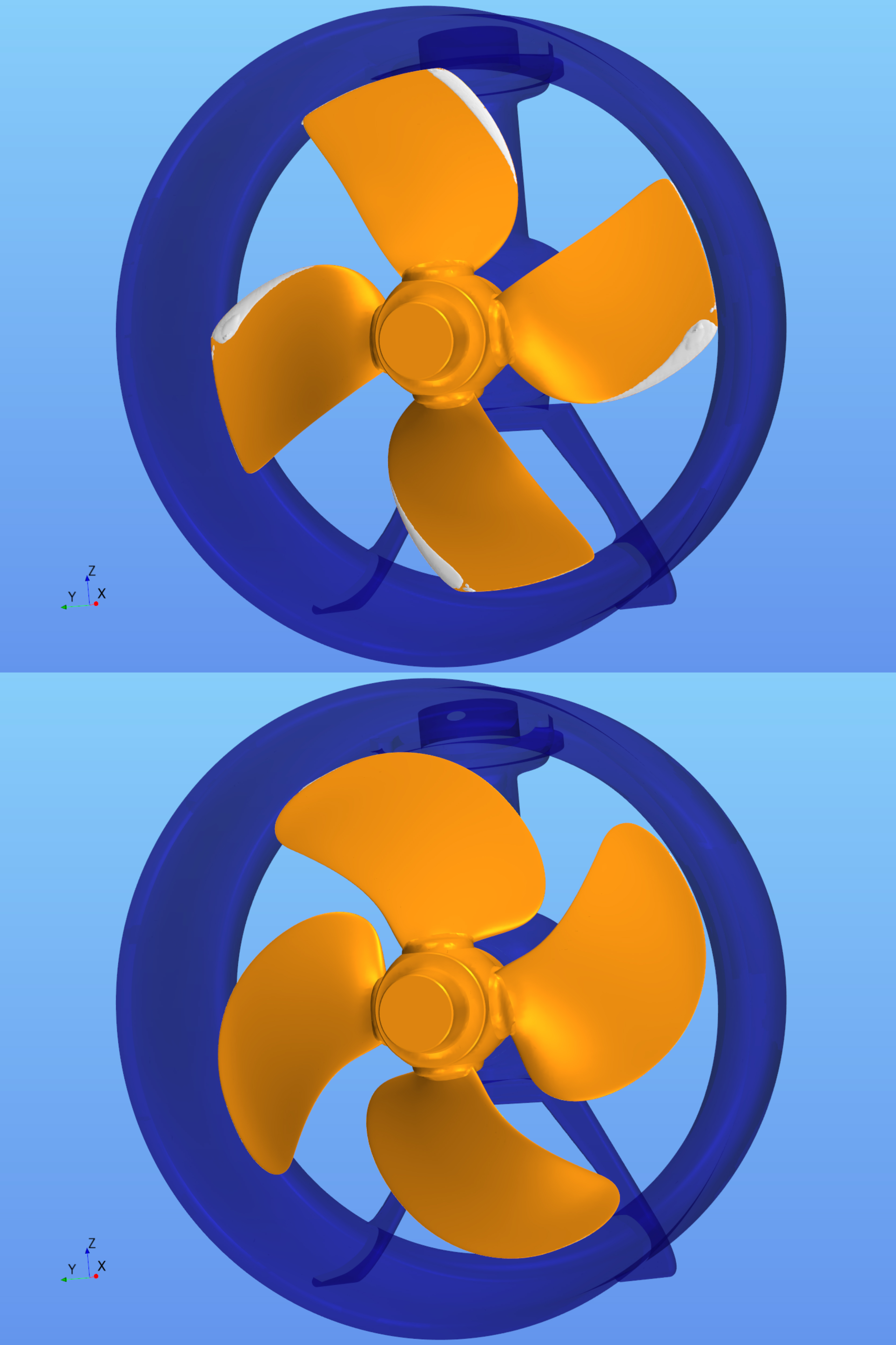 In the next picture, rounding the corners and losing the sharp angles improves the propeller inflow and increases thruster performance. The lower load fluctuations also mean that the propeller will have a longer lifetime.