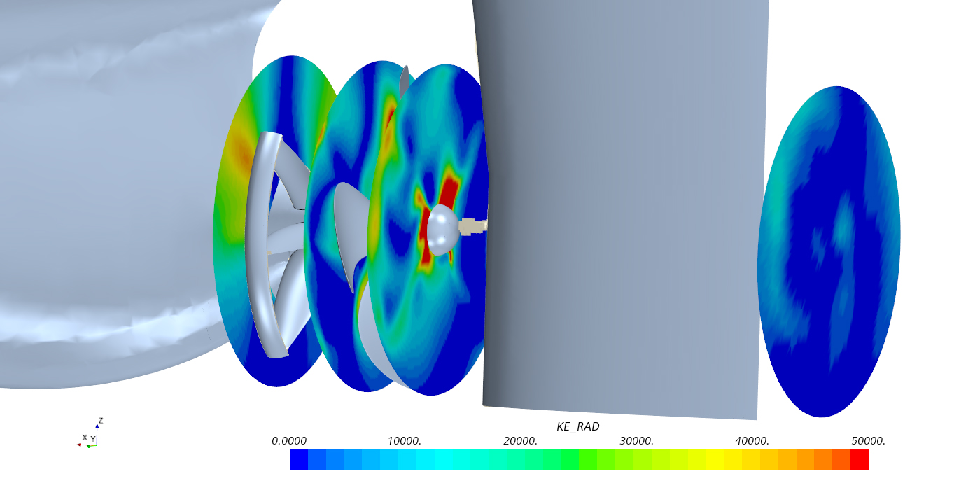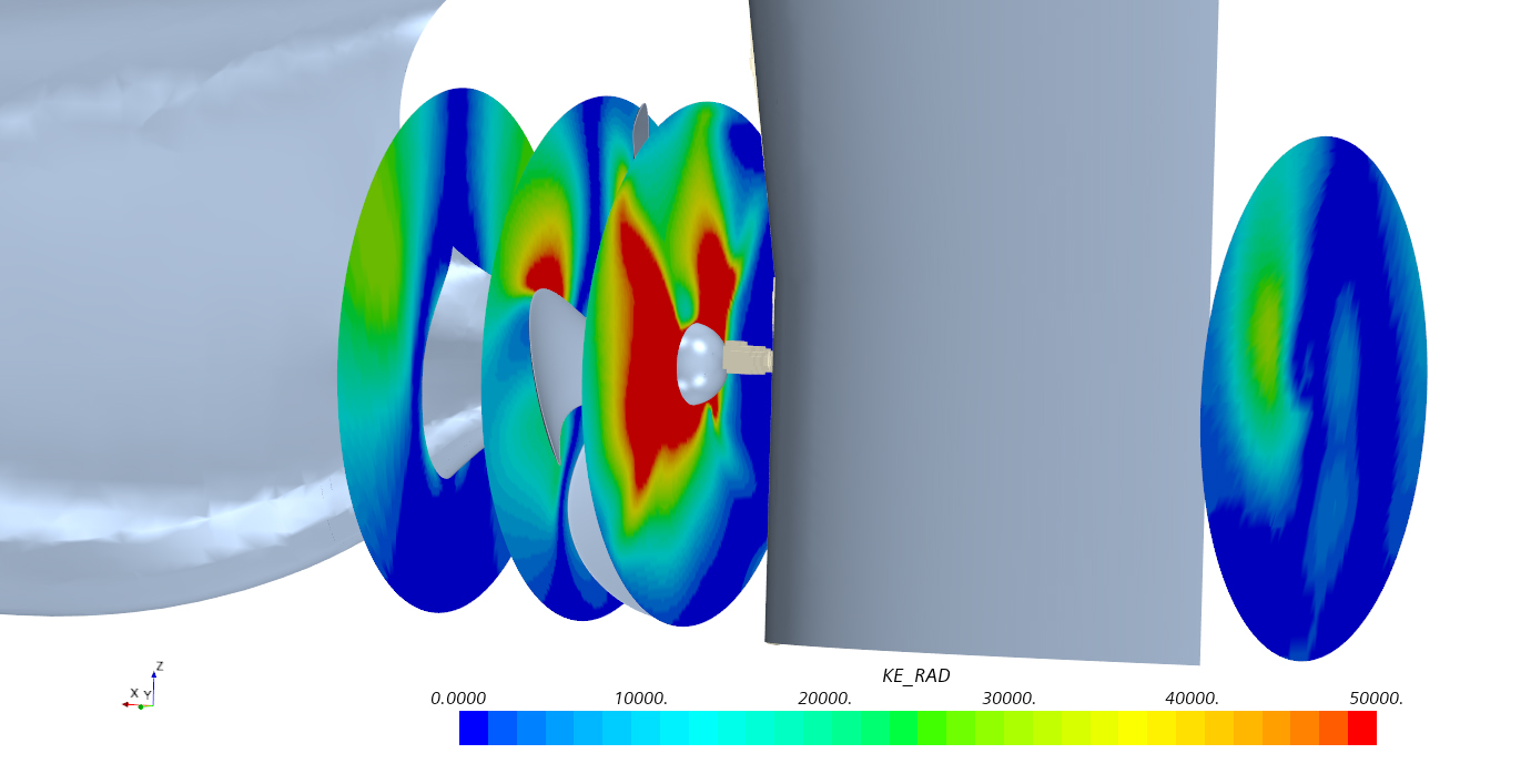CFD is the answer. The white in the picture below is cavitation and the patch by the propeller blade shows a problem in the next picture – bubbles of cavitation that will collapse and possible erosion on the blades and nozzle.