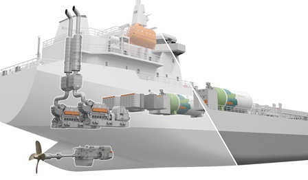 In a hybrid electric solution, multiple gensets provide propulsion and auxiliary power through a common electrical distribution system. Propulsion is provided by electric motors driving a FPP, enabling a highly flexible drive system.