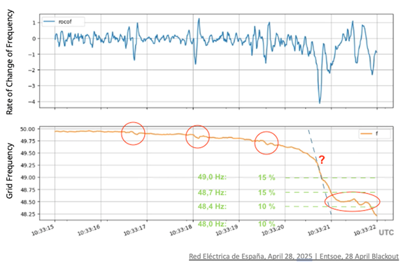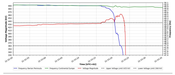 Image caption: The frequency and voltage in Spain and the rest of Europe on the day of the Iberian Peninsula Blackout. Source: ICS Investigation Expert Panel Factual Report, 2025