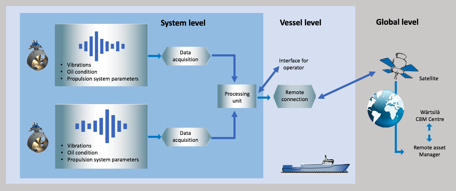 Figure 1 above shows the general layout of a vessel with two propulsors, which are both equipped with PCMS sensors and connected to one PCMS cabinet. The cabinet acquires and processes data from sensor readings and the propulsion control system according to the set operational parameters.