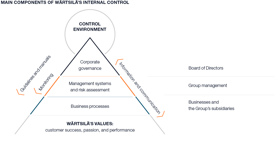 Internal control covers all the policies, processes, procedures and organisational structures within Wärtsilä that help the management, and ultimately the Board, to ensure that Wärtsilä is achieving its objectives, that the business conduct is ethical and in compliance with all applicable laws and regulations, that the company's assets, including its brand, are safeguarded, and that its financial reporting is correct. Internal control is not a separate process or set of activities but is embedded in Wärtsilä's operations.