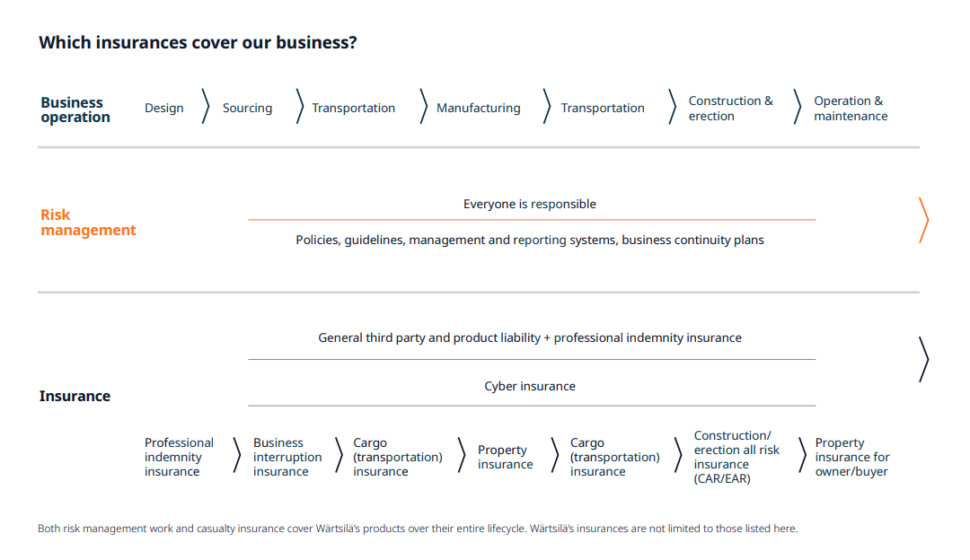 Wärtsilä uses appropriate insurance policies to cover indemnity risks related to its personnel, assets, and business interruptions, including supplier triggered interruptions, as well as third-party and product liability. Wärtsilä has its own captive insurance company, Vulcan Insurance PCC Ltd for insuring Wärtsilä’s own risks. For re-insuring purposes, the company is located on the island of Guernsey. Vulcan Insurance PCC Ltd’s results are consolidated into the corporation’s books and are subject to normal taxation in Finland.