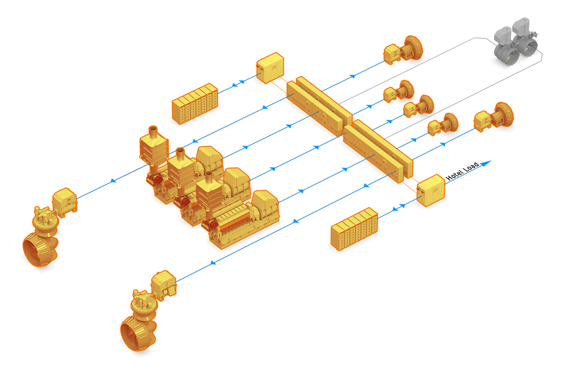 Because the power requirements depend on the operational mode, a flexible hybrid system offers many advantages. One example is the Wärtsilä hybrid propulsion system, which includes: