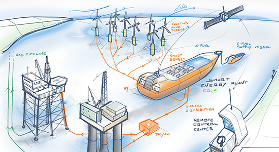 Electrification is part of the vision in the Oil & Gas market. When land-based electrification is not viable, one could set up an offshore floating energy hub with wind turbine power generation and swing generation from 4-stroke engines that would be fuelled either by green gas or by gas from the well. This concept would include proven technology: full or partial electrification of offshore assets through a connection to offshore renewables or to onshore power distribution networks.