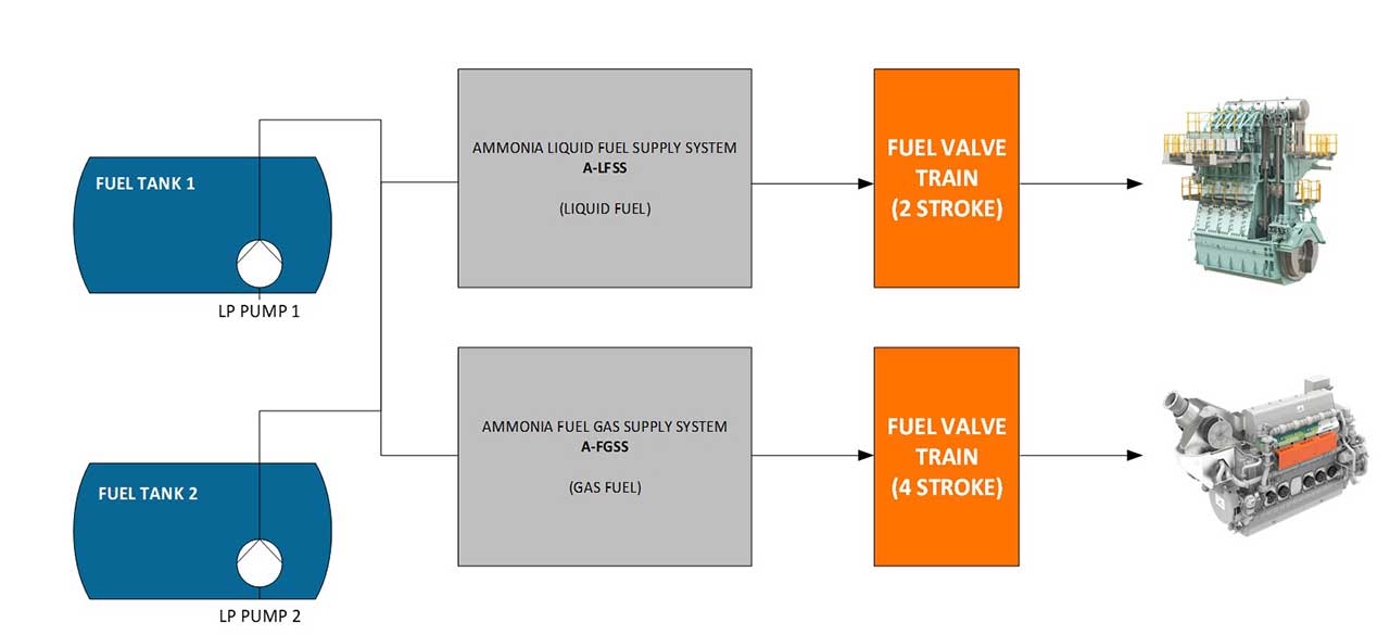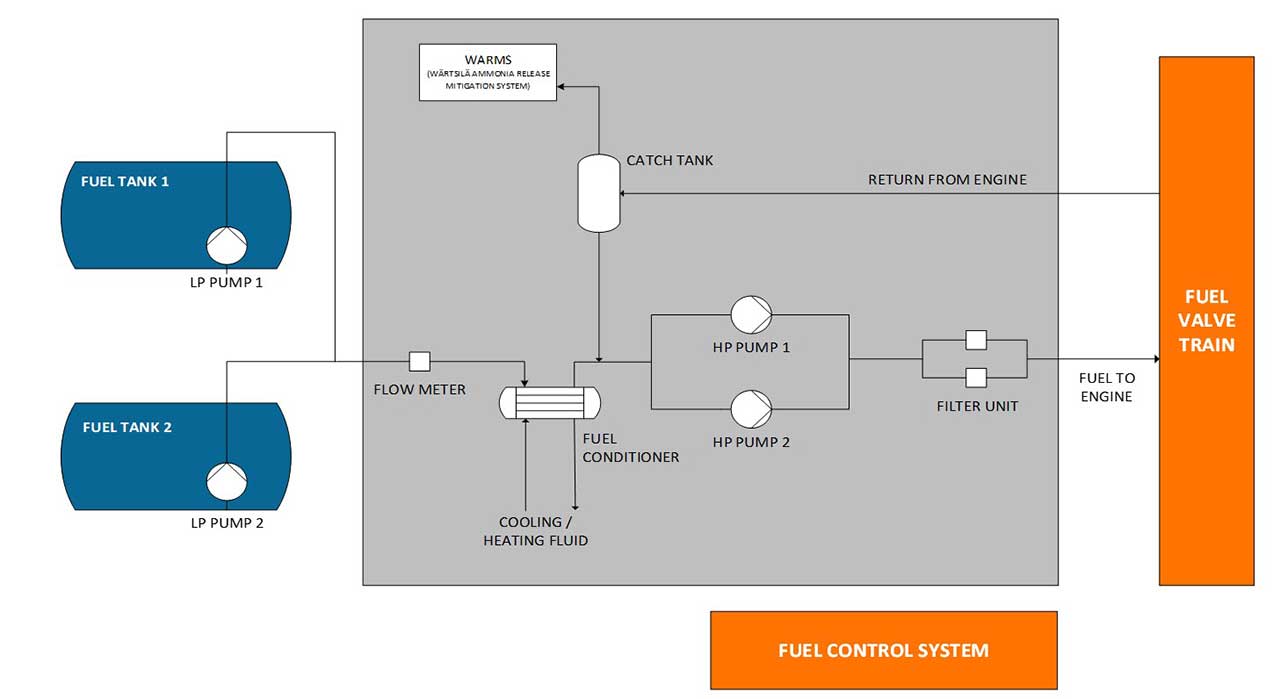 For non-gas carriers (IGF-coded ships) the system can be configured with dedicated fuel storage tank(s) optimized for the trade of the vessel. The Ammonia fuel tank(s) is loaded through dedicated bunkering lines, or in case of a Ammonia/LPG carrier reloaded from the cargo tanks. From the fuel tank(s), the Ammonia is conditioned and prepared as fuel. A system consisting of pumps and heat exchanger is used to supply the engine with a stable and reliable fuel flow, at the correct pressure and temperature.