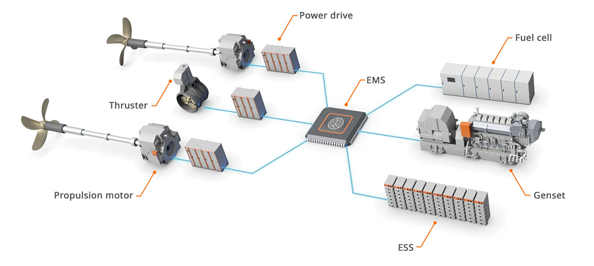 Wärtsilä HY consists of specifically engineered components – the engine, power drives, and the energy storage system also with optional fuel cells. Its “brain” is the Energy Management System EMS, which controls the flow of energy between different power sources.