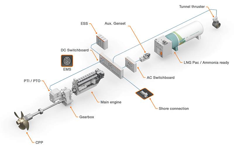 The hybrid-mechanical Controlled Pitch Propeller is teamed with energy storage and shore connection. The power is provided by alternative fuels. The resulting set-up integrates the propulsion system and electrical distribution.
