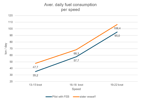 The pilot installation of Wärtsilä Fuel efficiency boost shows around 10~12 ton / day lower fuel consumption than sister vessel in the same route and resulted to 1,195 ton of fuel saving in 9 months.