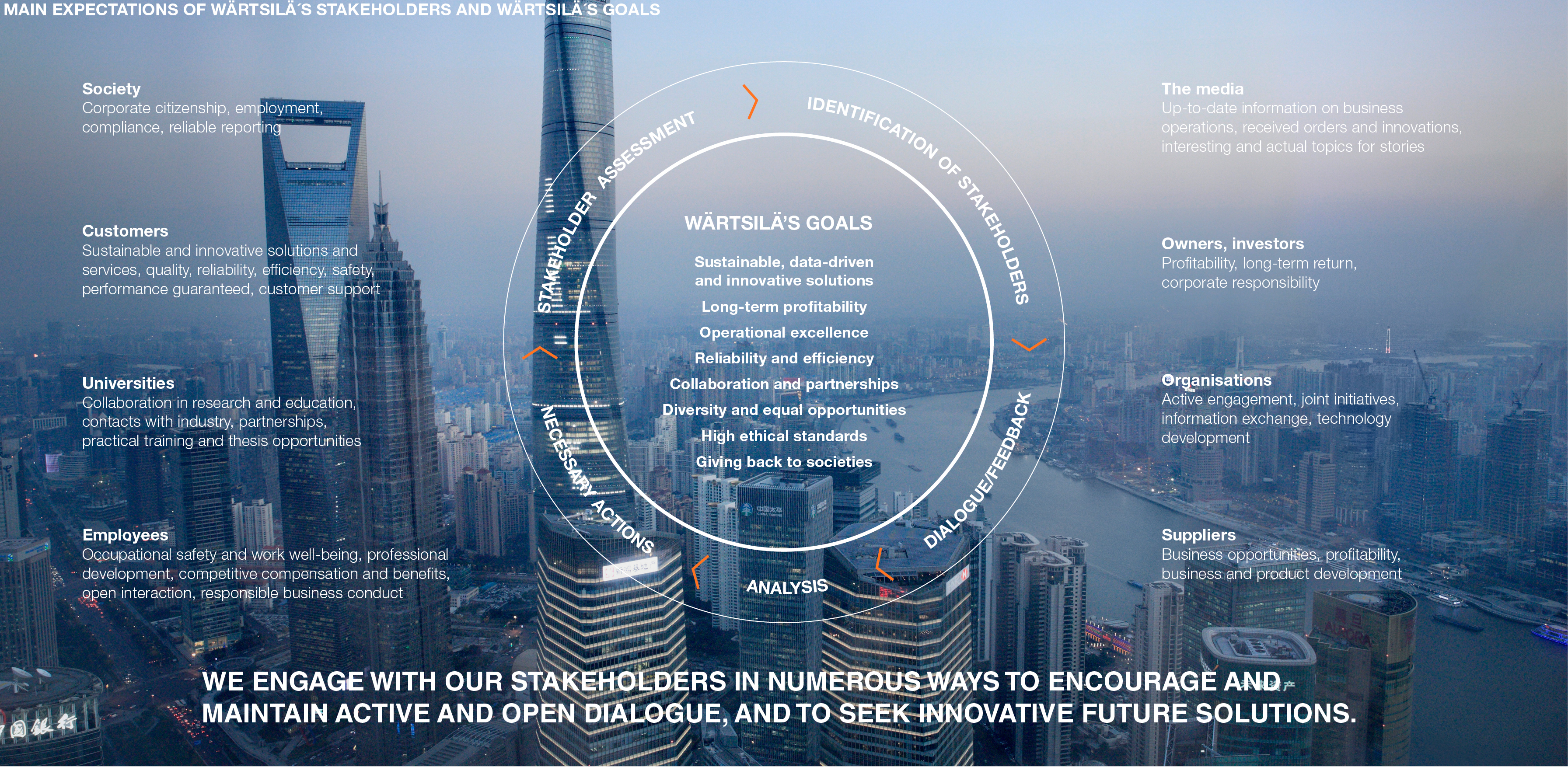 At the corporate level, we have defined our most important stakeholders as being our customers, owners, suppliers, employees, and society in general. Wärtsilä subsidiaries define their own primary stakeholders. In addition to the ones mentioned above, these typically include residents close to production plants, educational institutes, and public authorities. Wärtsilä’s Code of Conduct and supporting policies provide the foundation for the management of stakeholder relations. The guiding principle of our Code of Conduct is to promote openness and good interaction with our stakeholders, both internationally and locally.